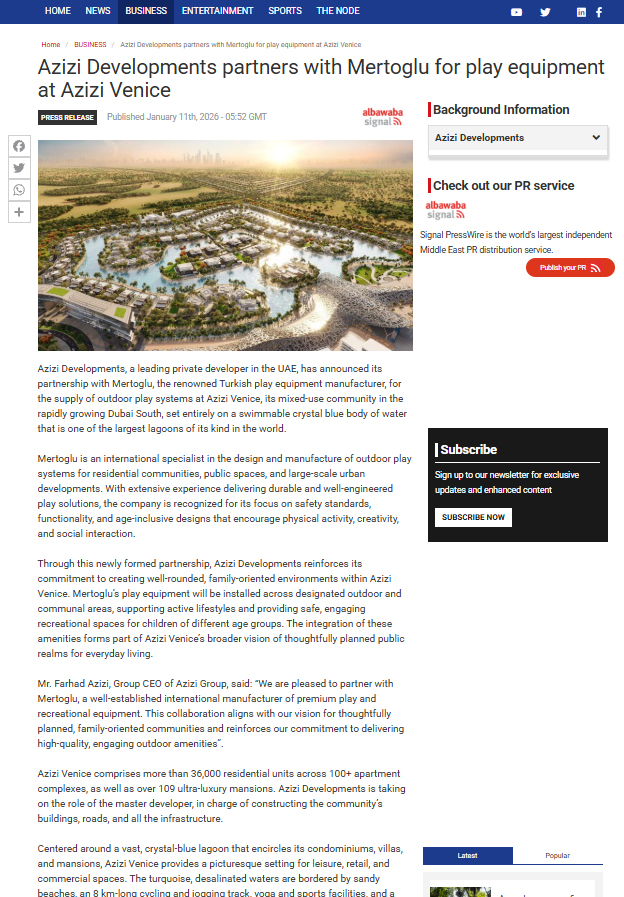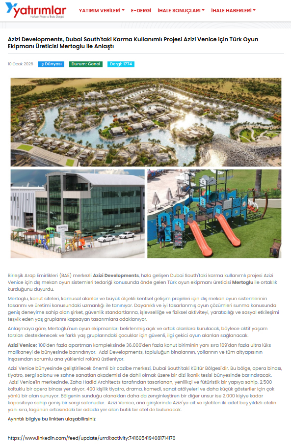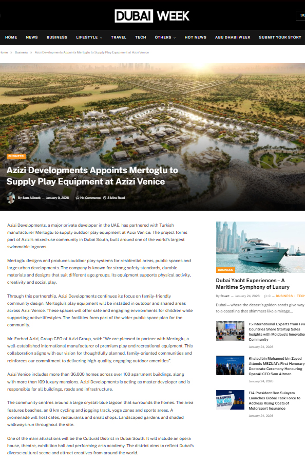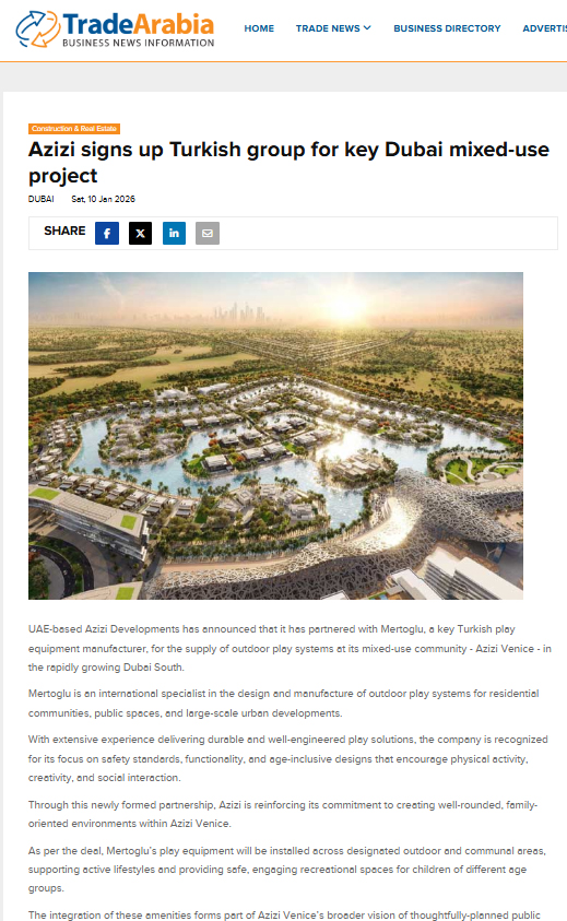 Birleşik Arap Emirlikleri merkezli Azizi Developments, Dubai South’ta hayata geçirdiği prestijli Azizi Venice projesinin dış mekân oyun sistemleri tedariği için, Türkiye’nin önde gelen oyun ekipmanı üreticisi Mertoğlu ile iş birliği yaptı.